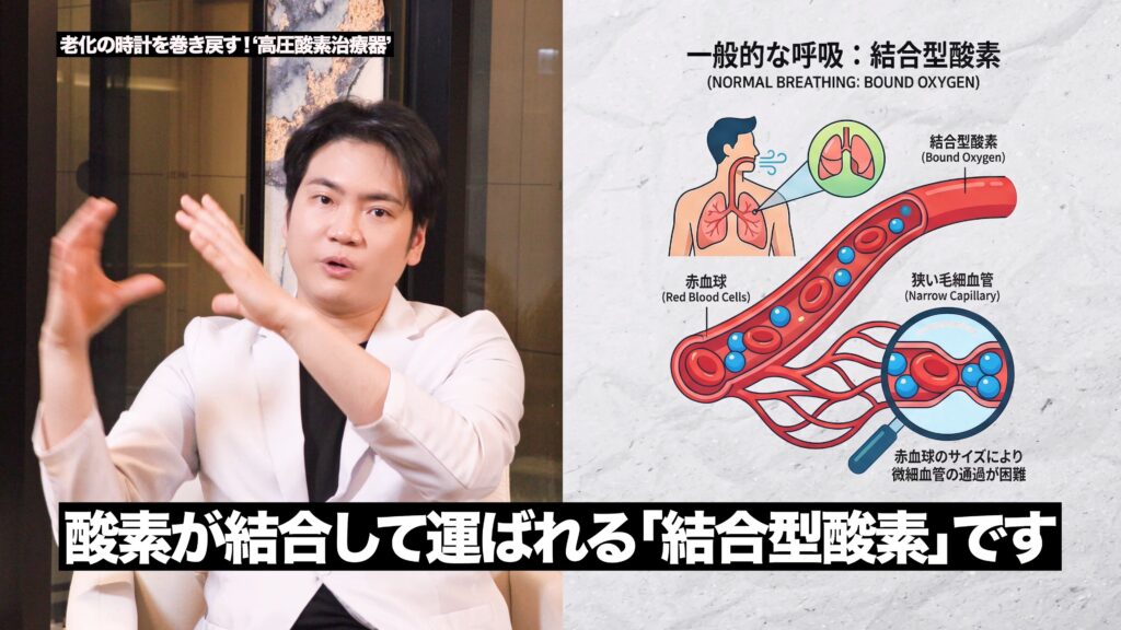 毎日呼吸をしながら吸う酸素は、赤血球のヘモグロビンと結合して私たちの体に運ばれます。これを結合型酸素と呼びますが、問題は赤血球のサイズが思ったより大きいということです。結果として、私たちの体の非常に微細な血管や末梢神経まで酸素が適切に到達しない場合が多くあります。