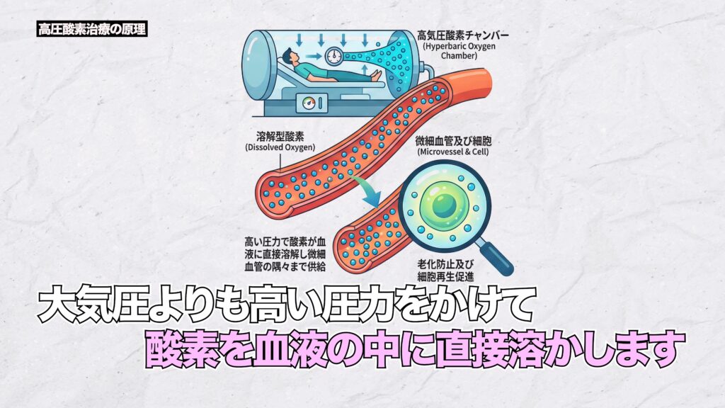 高気圧酸素治療機は、大気圧よりも高い圧力をかけて酸素を血液中に直接溶かす方式で作動します。このようにして生成された「溶解型酸素」は、赤血球に付着した酸素とは異なります。粒子がはるかに小さいため、赤血球が到達できない非常に微細な血管の末端まで酸素を供給することができます。