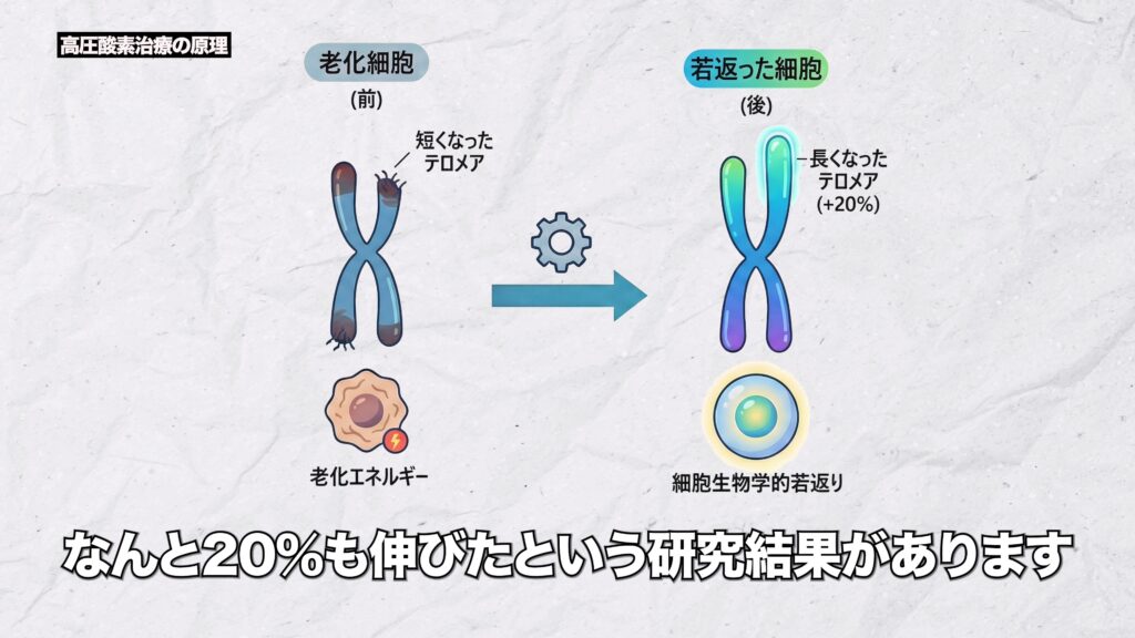 一般的に、テロメアは加齢とともに自然に短縮します。しかし、高気圧酸素治療によってテロメアが再び長くなったということは、細胞レベルで「若返り」が起こったことを示唆しています。これは現代医学で発見された最も強力なアンチエイジング方法の一つと見なすことができます。