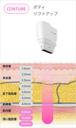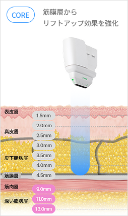 モードの両方で照射できるリフトアップ施術です。カートリッジの深さの種類が豊富で、真皮層やSMAS層な