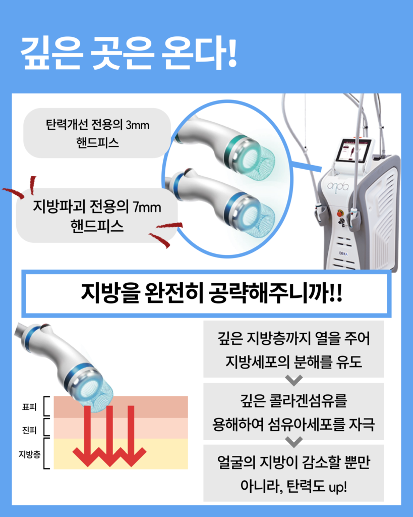 핵심 원리: 피부 표면의 밝기를 개선하는 동시에 진피층과 더 깊은 유지인대까지 에너지를 전달합니다. 피부가 상대적으로 얇은 여성분들에게 과한 지방 손실 걱정 없이 즉각적인 탄력과 톤업, 그리고 쫀쫀한 피부결을 만들어드리는 데 아주 적합하죠.