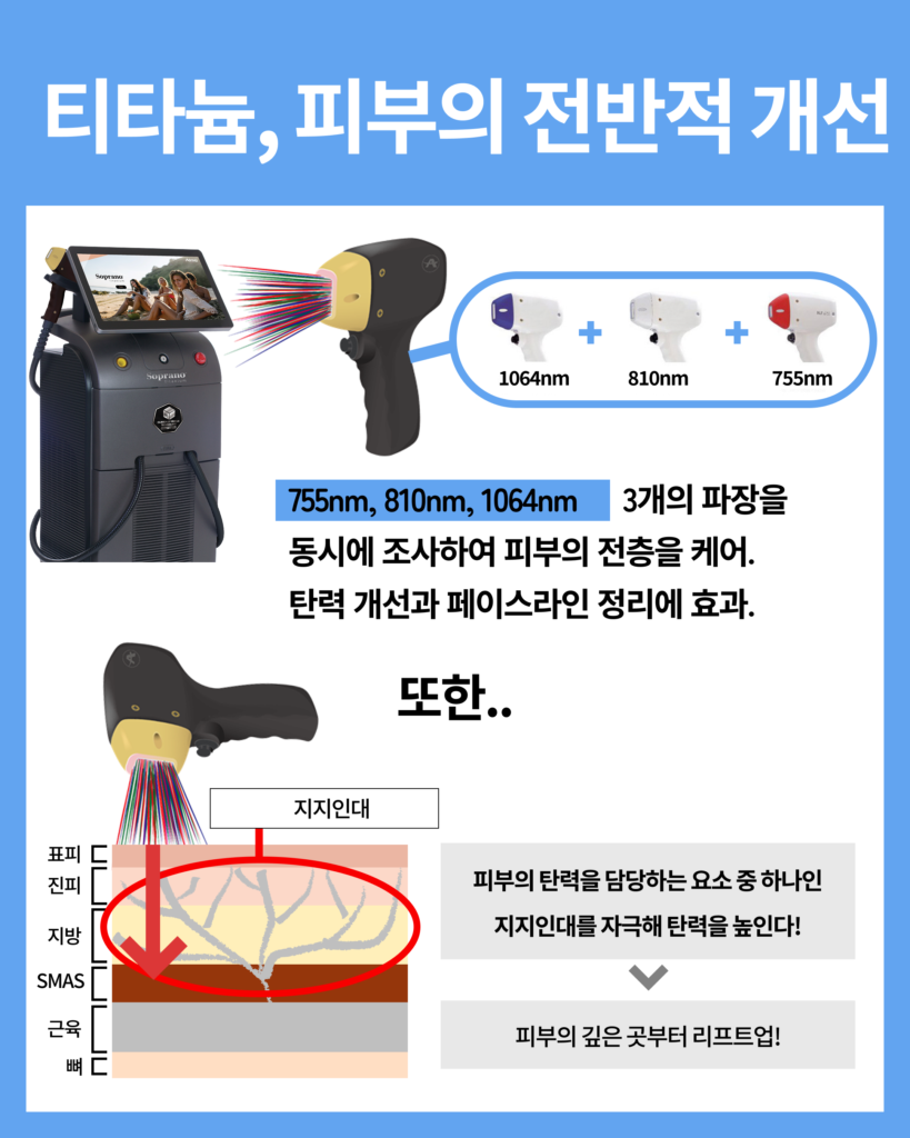 - 티타늄(Titanium)은 그보다 얕은 층과 중간 층을 공략해 즉각적인 리프팅감과 피부 광채를 끌어올립니다.