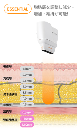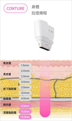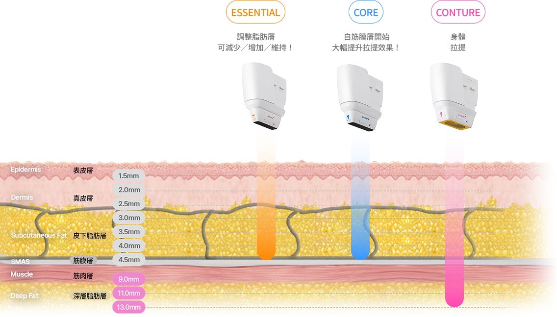 強力的 HIFU 能量可 深入 9~13mm 的深層部位,於脂肪層形成熱凝固點,減少脂肪並提升彈性。