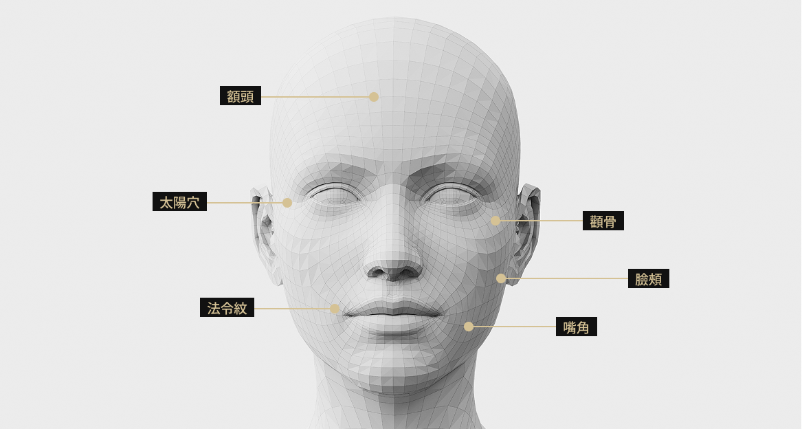 適用於範圍廣泛的部位,包括太陽穴、前臉頰、前顴骨、法令紋、嘴角與側臉頰等。